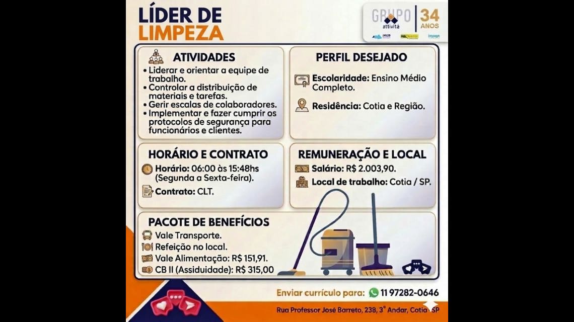 Liderar e orientar a equipe de limpeza; cronograma de atividades; diluição de produtos; controle de entrada e saída da equipe; acompanhar o desempenho das atividades no dia a dia; além de ajudar na limpeza auxiliar os colaboradores; acompanhar o check list das rotinas; controlar a distribuição de materiais e equipamentos; manutenção e a organização dos setores.
